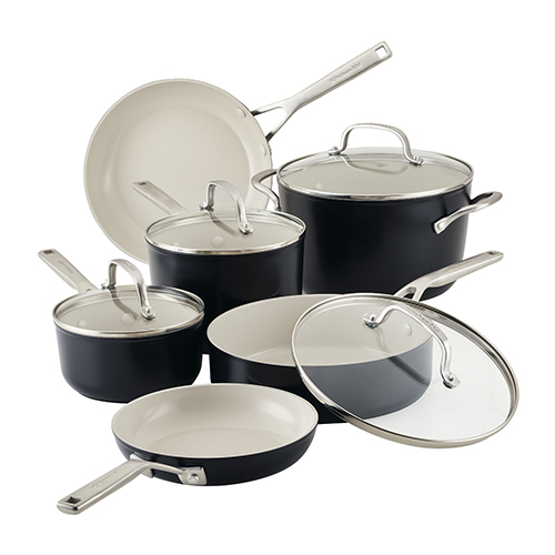 Made for everyday cooking and beautiful kitchen-to-table presentations KitchenAid Hard Anodized Ceramic Cookware is finished with an easy-clean ceramic nonstick interior and a durable hard-anodized exterior crafted with thick forged aluminum bases and rims to deliver excellent heat conduction and durability. This 10-piece set of kitchen pots and pans is 8x harder than aluminum for lasting performance and includes two frying pans two saucepans a versatile sauté pan and a deep stockpot. Bring standout recipes to life in stylish cookware finished in matte black color to suit the contemporary kitchen. Practical features designed for convenience and control include shatter resistant tempered glass lids and double-riveted stainless steel handles. The long-lasting ceramic nonstick means you'll need less oil (for healthier cooking) and enjoy fast and easy cleanup of sticky and saucy recipes. Oven safe to 500ºF (glass lids to 350ºF) this performance-worthy and presentation-ready cookware set will have your kitchen equipped to make the most of any meal.