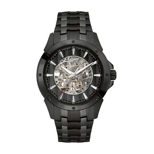 BULOVA MENS AUTOMATIC BLACK STAINLESS STEEL WATCH, OPEN SKELETON DIAL